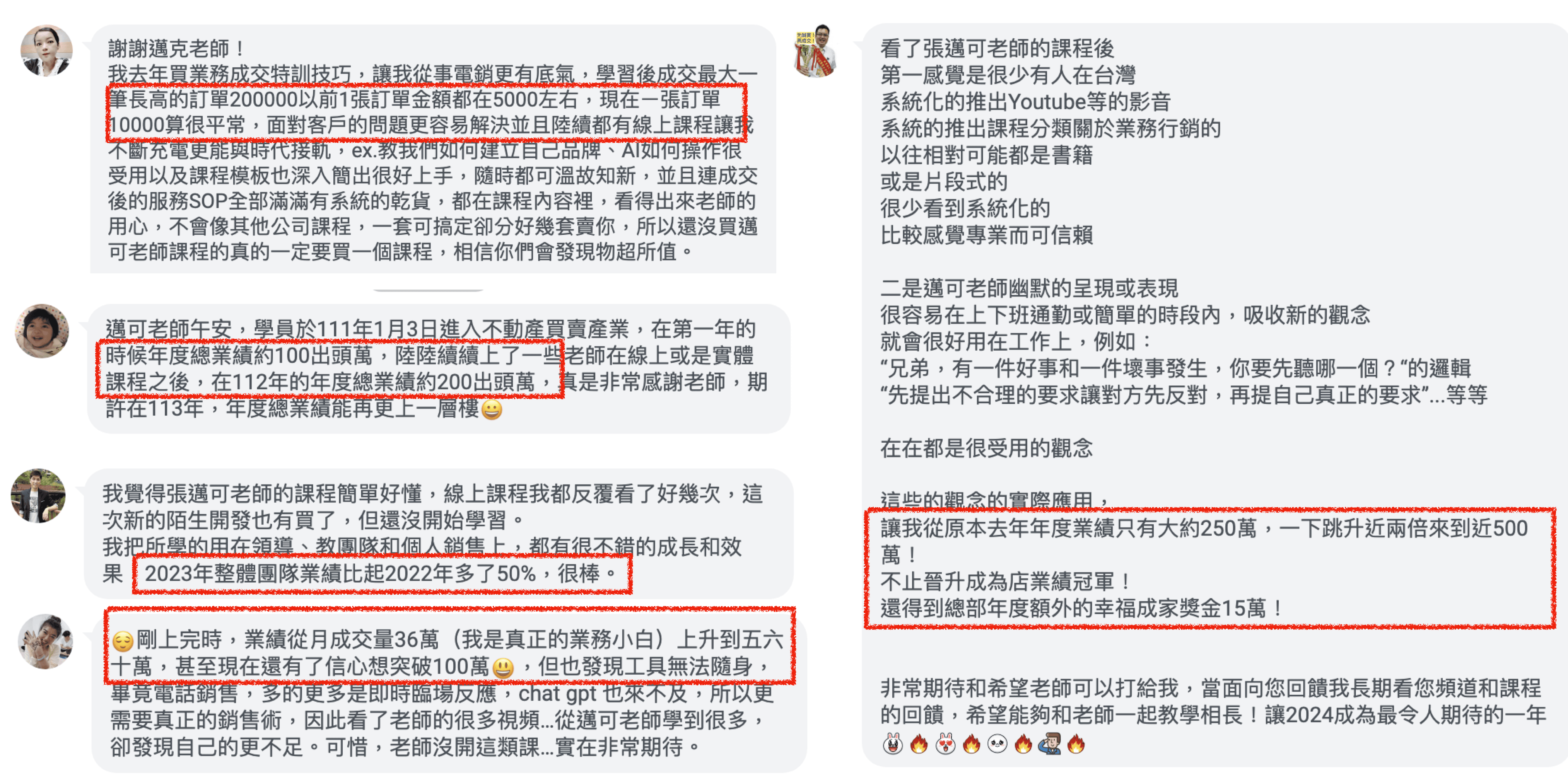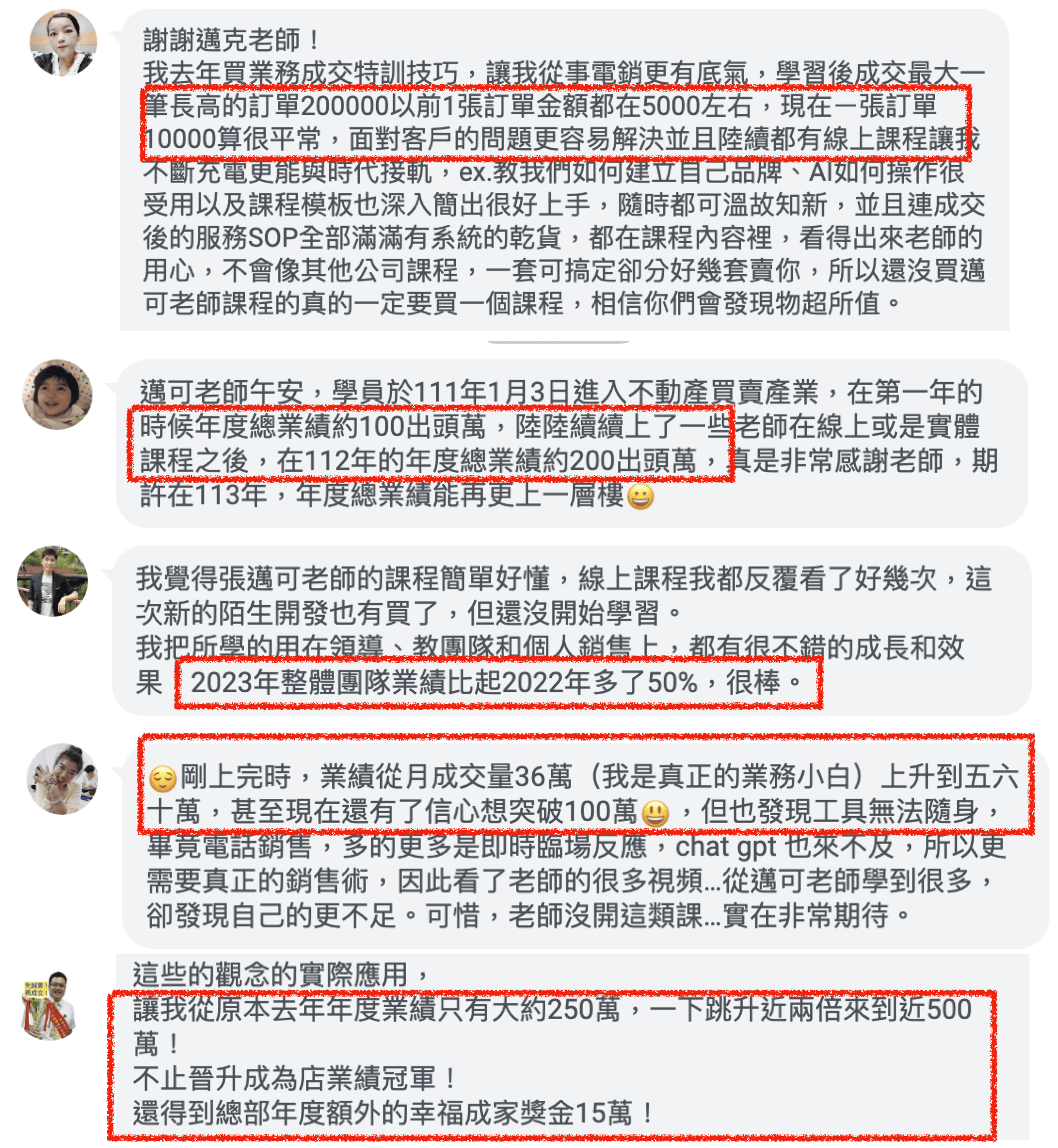 {免責聲明} 成交的技術並不是一種快速致富的伎倆,而是一個真的能幫助顧客解決問題、利用你的服務或產品來並提升狀況的工具。 我相信業務員的價值在於幫助與服務顧客,這是我設計此課程的初衷。上面提到的任何成績或銷售數字,都是我經過投入學習與努力的成果,並不代表每一個人都能達到同樣的狀態,也不是在暗示您可以獲得相同的成果。 多數購買資訊教學產品的人都無法獲得預期的成果,而學習成果也會因人而異。這取決於許多因素,包括但不僅限於您的經驗、背景、學習態度、與願意投入的時間與注意力。我僅將這些成果用於示範與參考目的。 所有事業或投資都伴隨著風險,也都需要有學習的意願、並願意投入大量的努力和行動來達成目標。如果您不願意接受,請不要參加此培訓或購買我的課程。如有任何疑問,歡迎透過張邁可官方line@與我們聯繋。